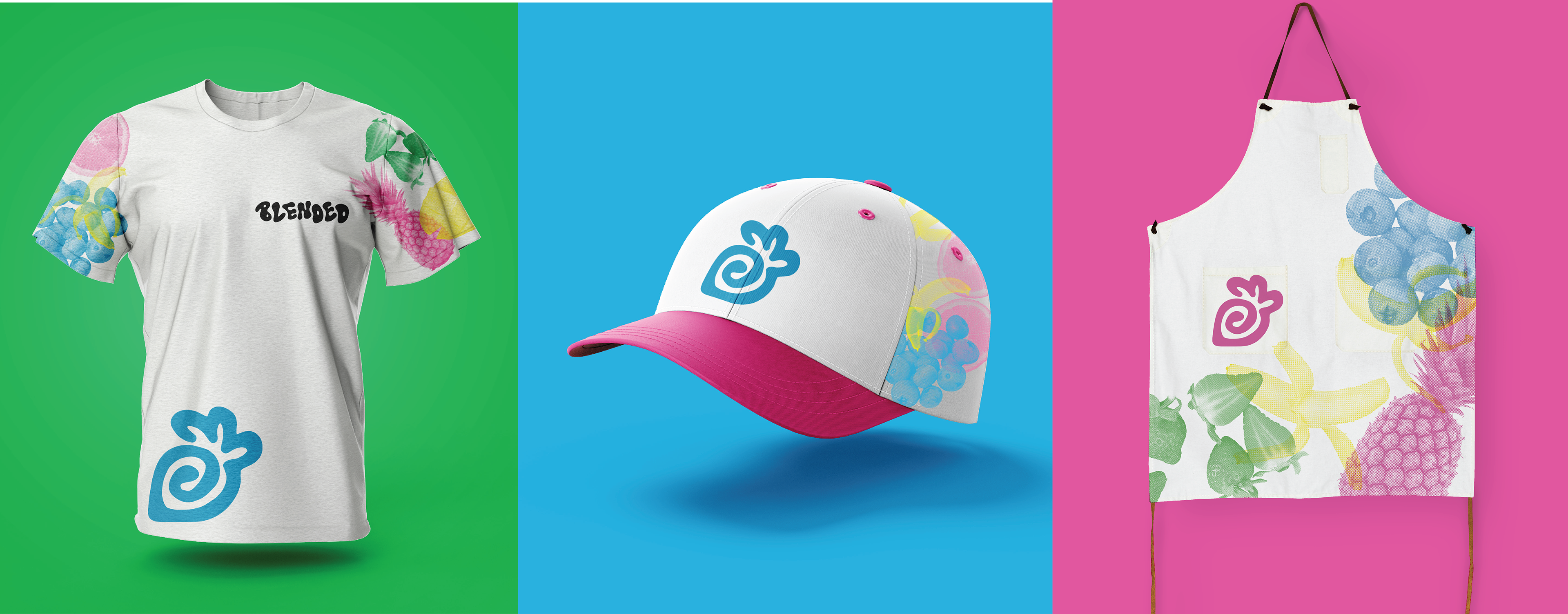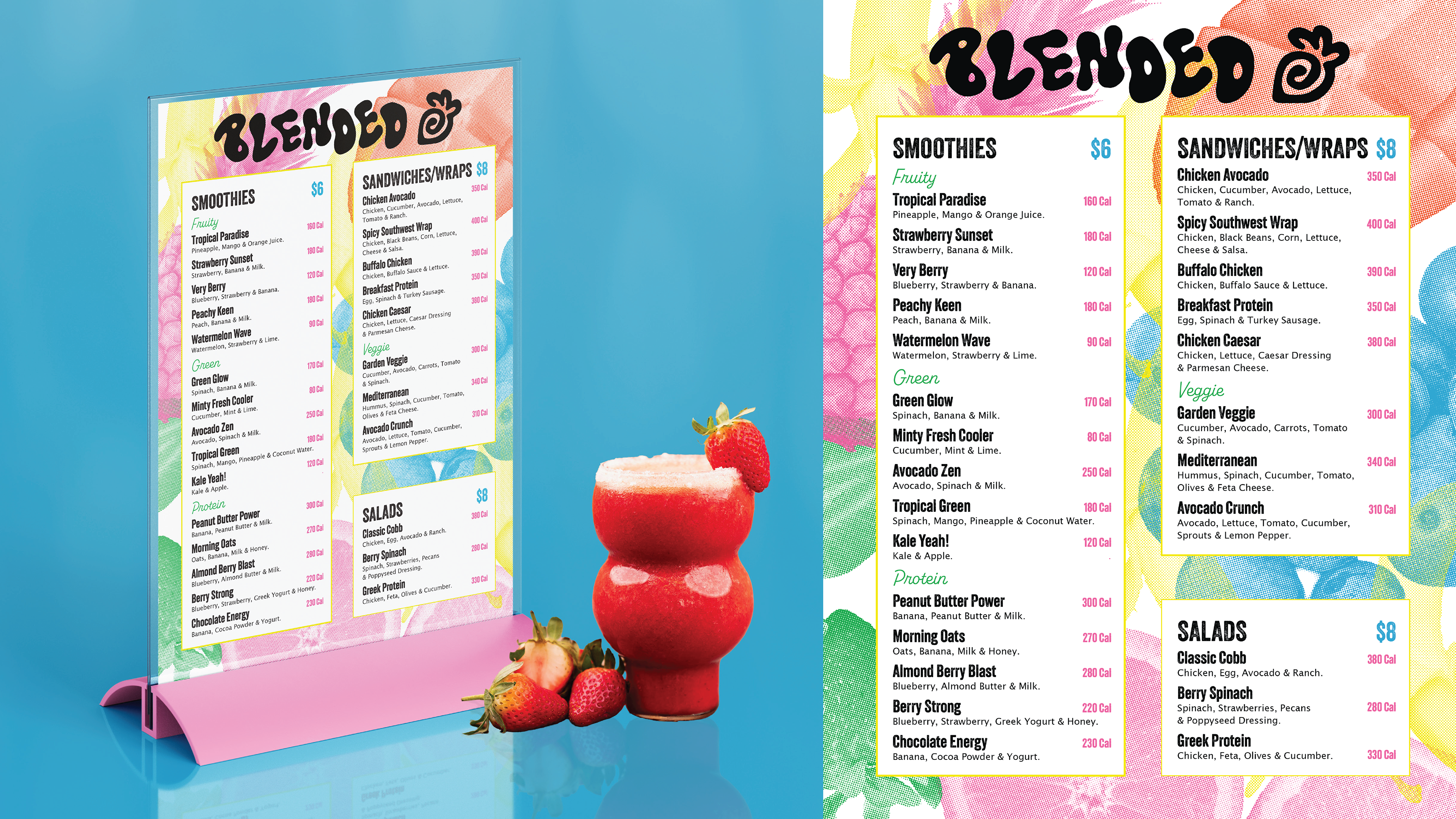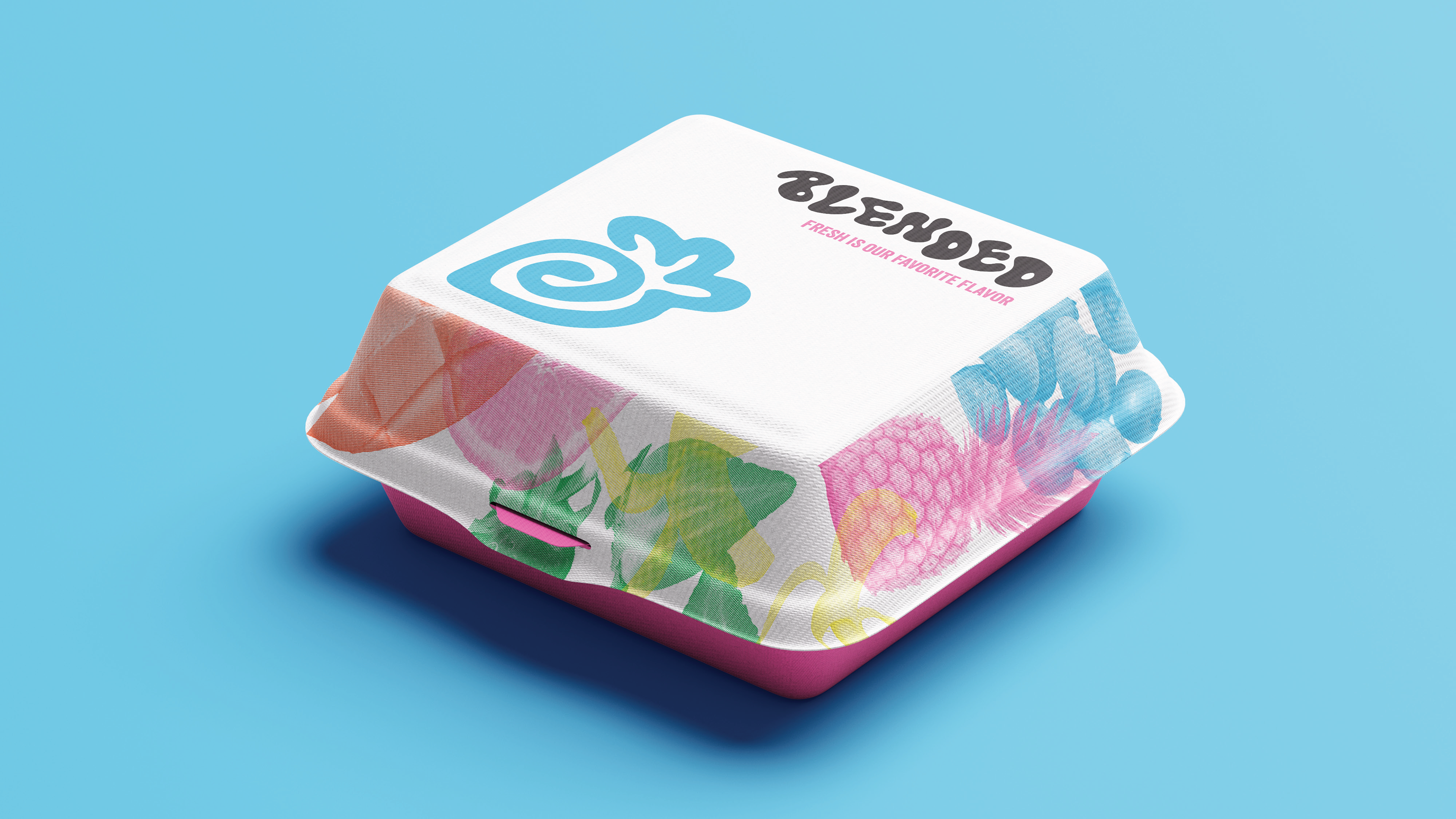 This is Blended, a smoothie restaurant with bright colorful branding. This brand focuses on serving healthy food in a sit-and-stay-a-while style cafe.