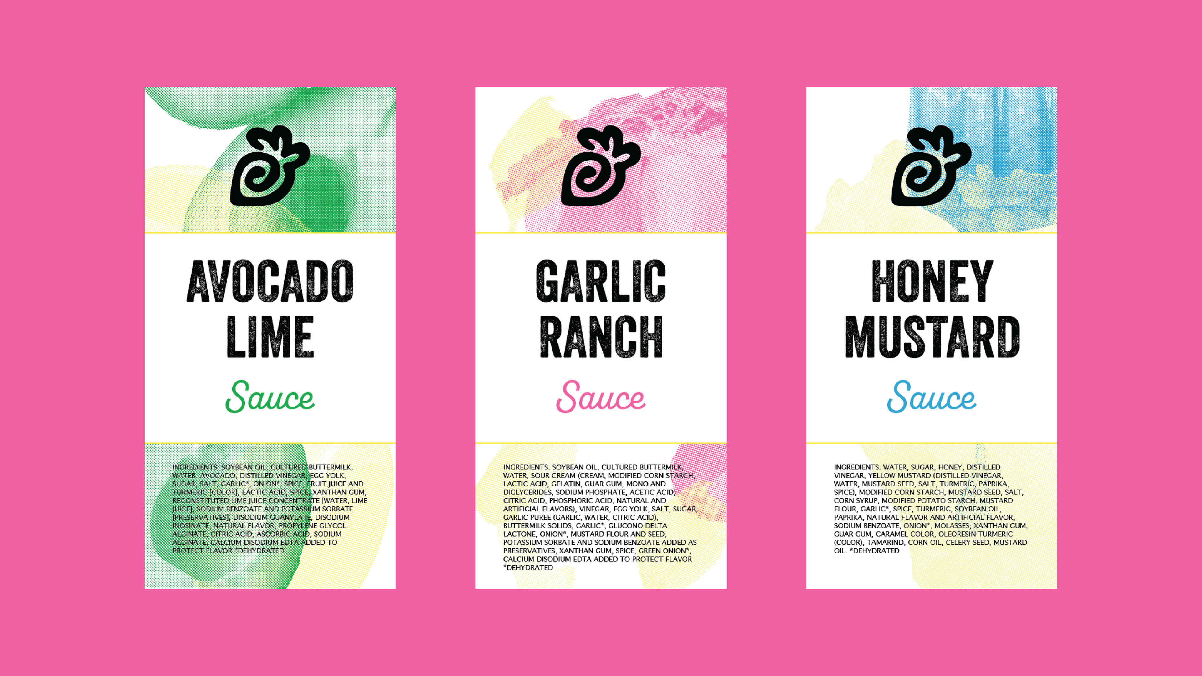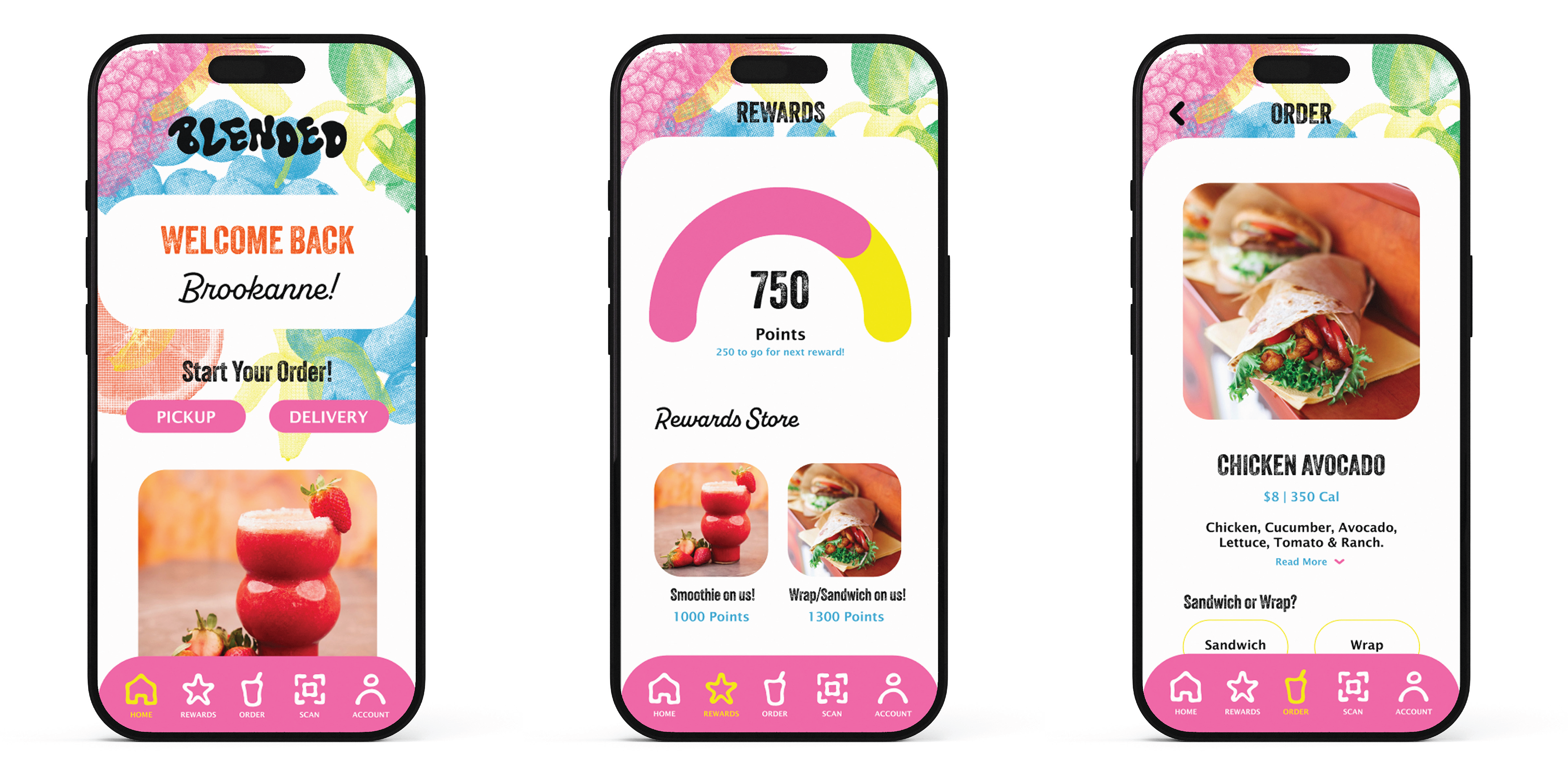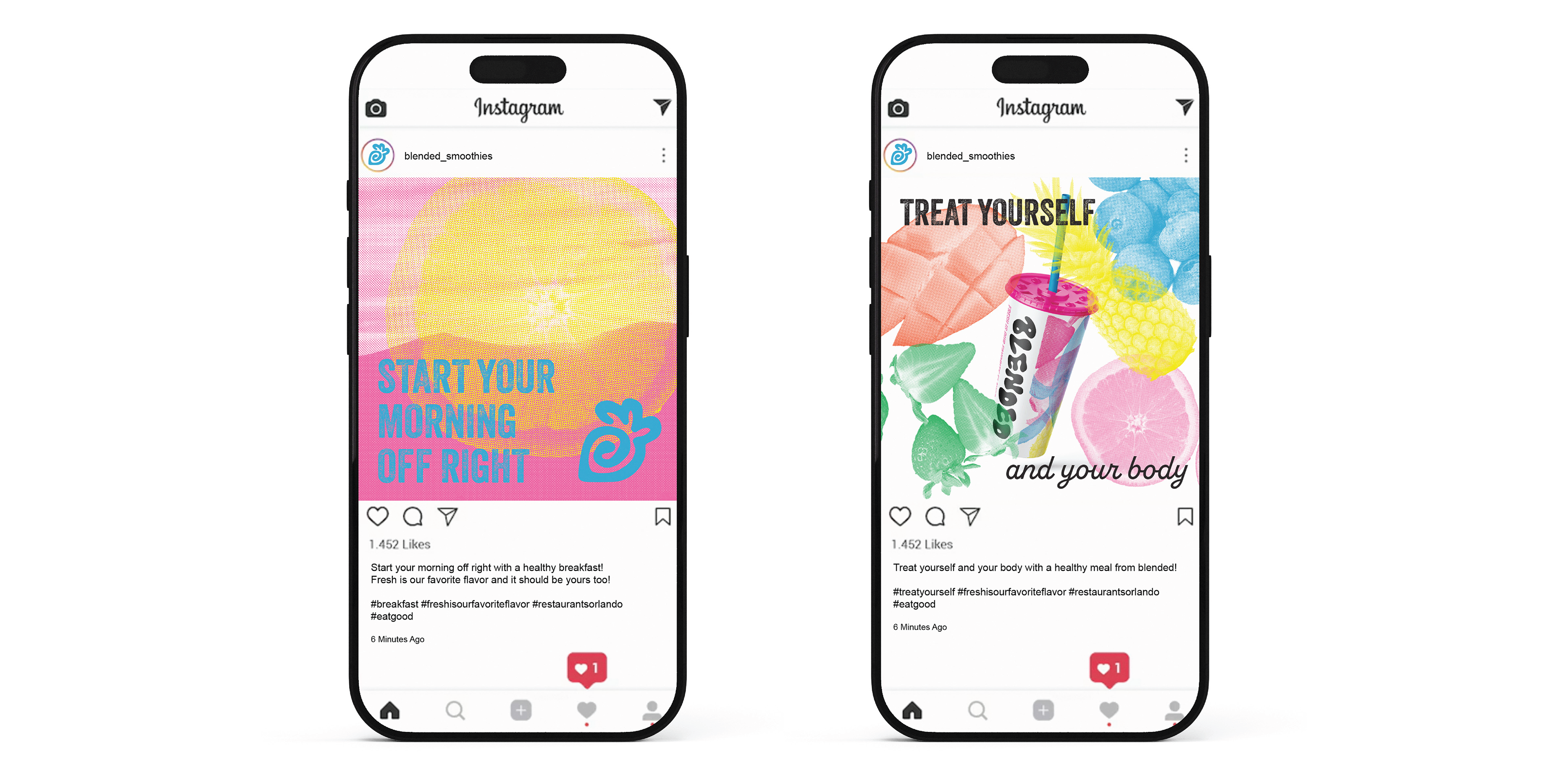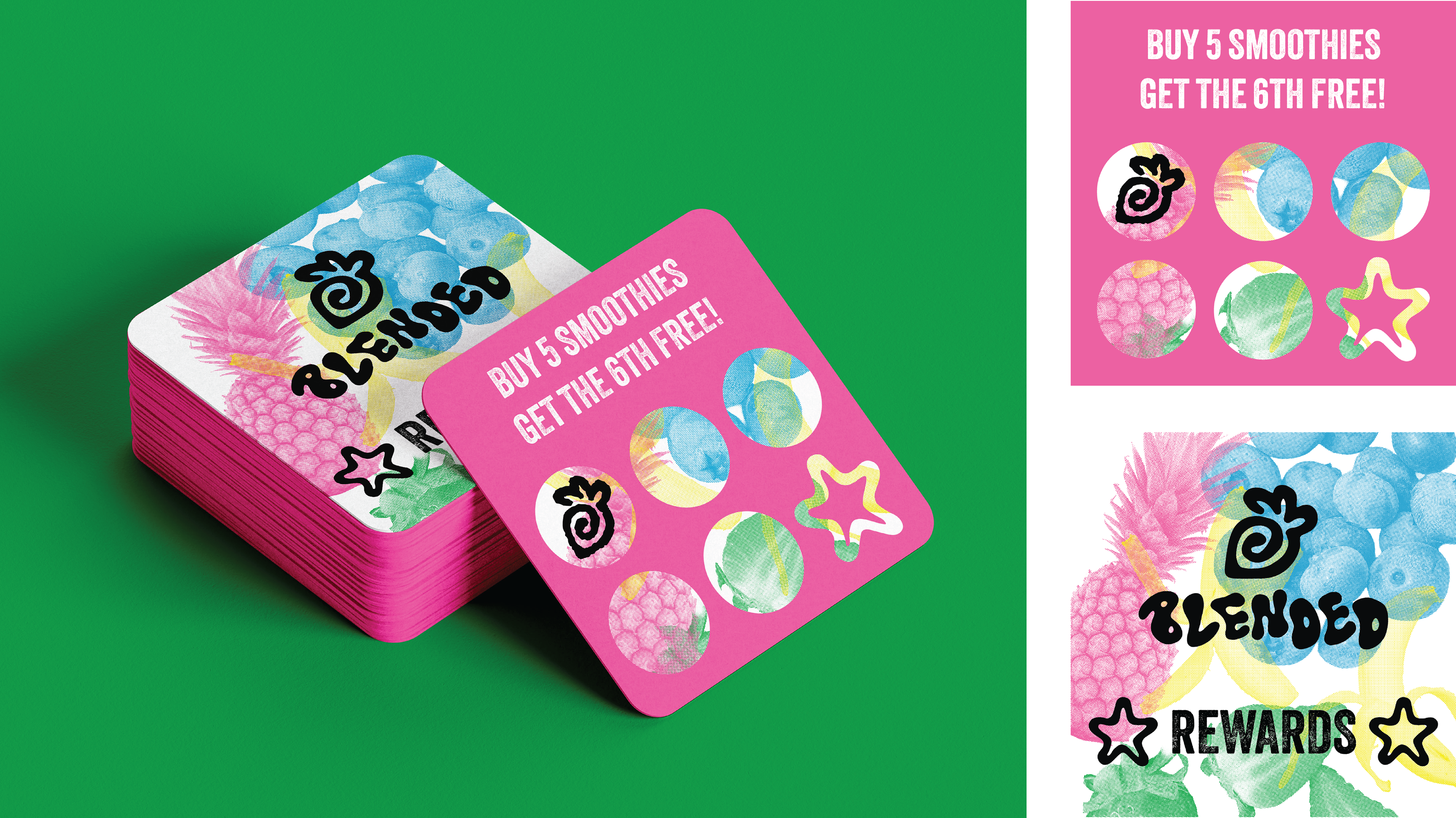 This is Blended, a smoothie restaurant with bright colorful branding. This brand focuses on serving healthy food in a sit-and-stay-a-while style cafe.
